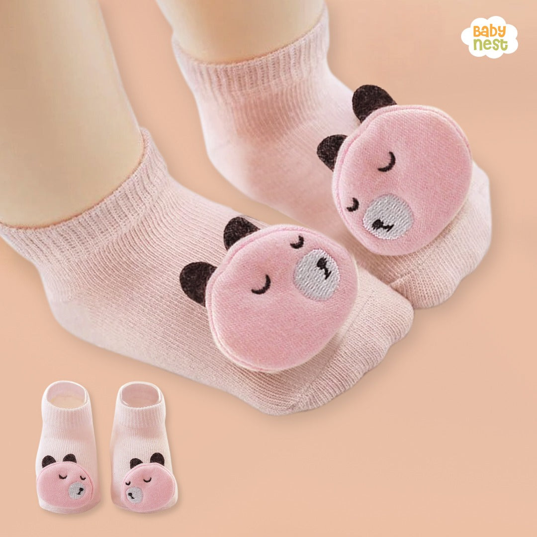 Soft, cozy socks designed for infants aged 0-3 months. Featuring an adorable bear face with closed eyes and a peaceful expression, perfect for keeping tiny toes warm and cute. Made of gentle material suitable for delicate baby skin.