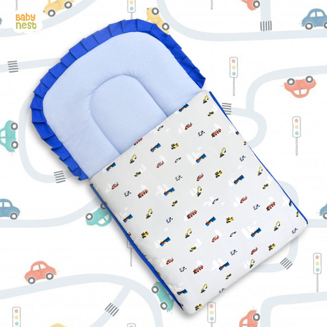 Babynest Boutique Cotton Carry Nest & Sleeping Bag Light Blue Truck Print