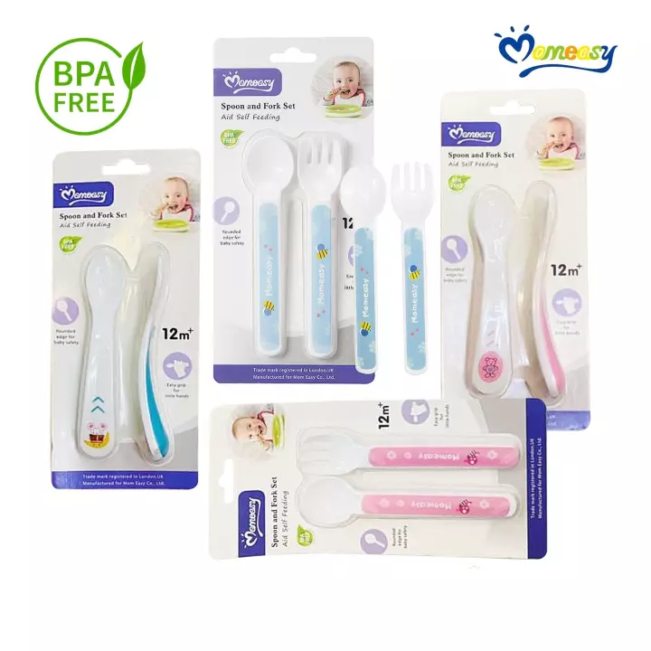 Momeasy Spoon and fork set have soft spoons that help to protect sensitive gums. Rounded edges do not irritate delicate babyâs gums. The spoon will be useful when expanding your diet. It is made of safe materials without BPA. It can be washed in the dishwasher. These spoons are suitable for children aged 4 months. Spoon Feeder â Momeasy Spoon and Fork Set are perfectly shaped for little mouths. It has comfortably curved handles that help the baby grip. Its deep scoop spoon to hold more food and curved fork is safe. It also helps the child to take food and eat almost all by himself.