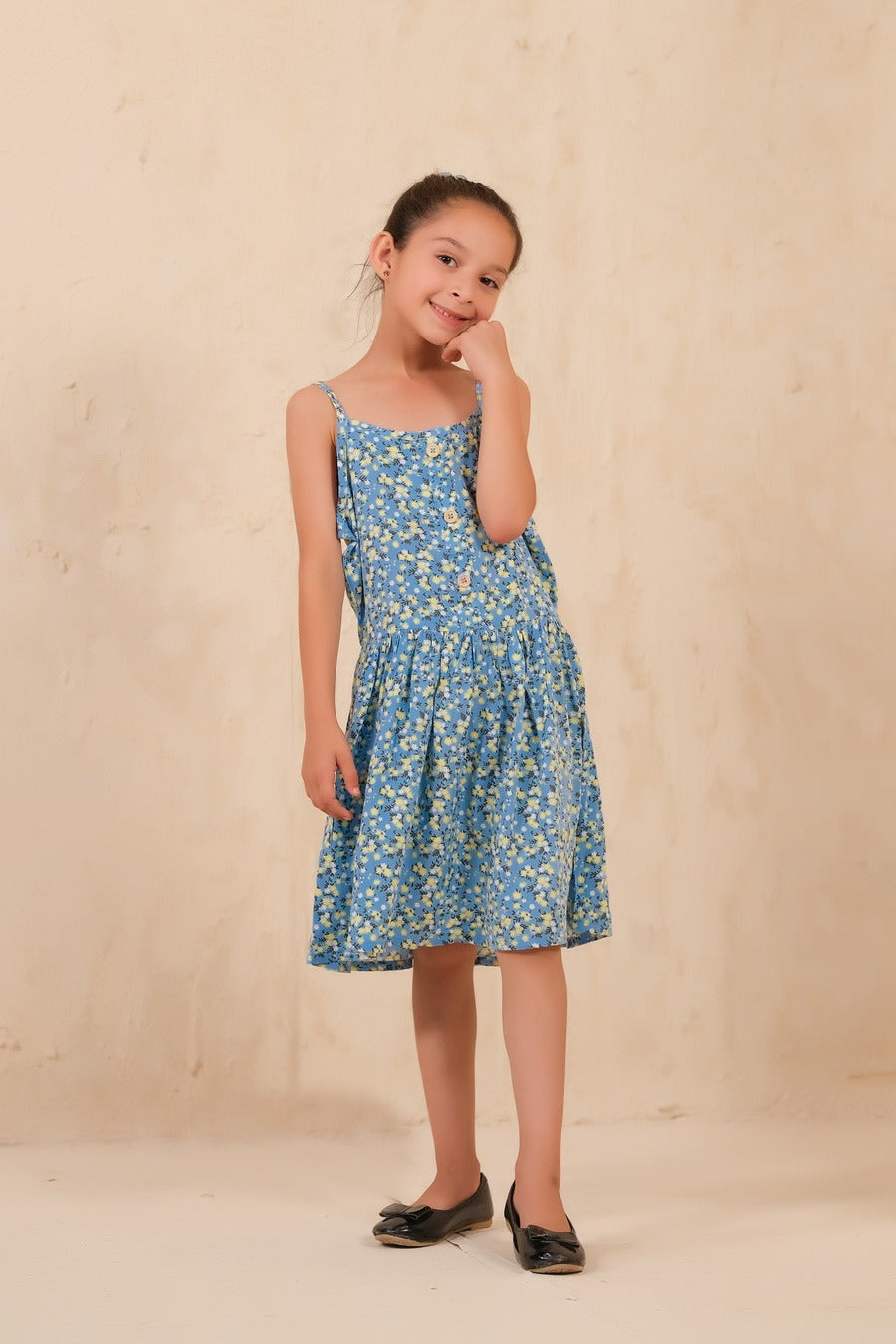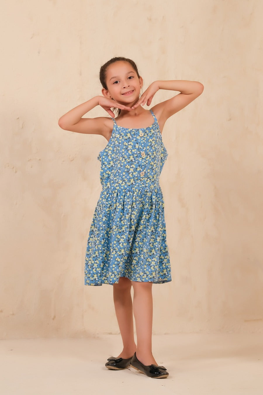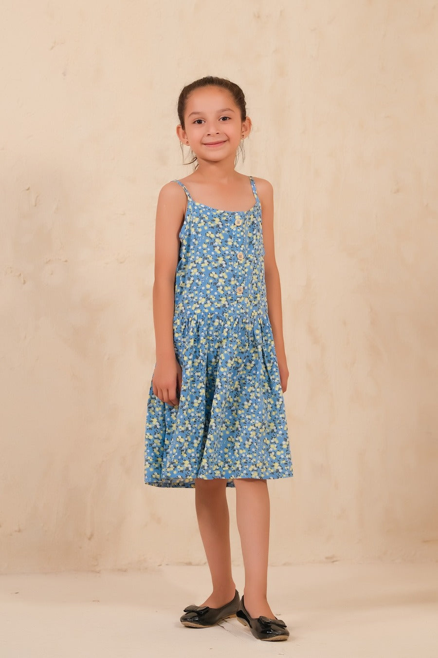 This summer floral frock is a vibrant and feminine dress that perfectly captures the essence of the season. It features a lightweight and breathable fabric, making it ideal for hot summer days. The dress showcases a beautiful floral pattern, with blooming flowers in various colors scattered across the fabric. The design typically includes a fitted bodice that accentuates the waist and a flowy skirt that falls gracefully to the knees or mid-calf. This floral frock incorporates delicate details such as a sweetheart neckline, spaghetti straps, sleevesless, adding a touch of charm to the overall look. This dress is a delightful choice for any summer occasion, be it a garden party, a picnic, or a casual day out, as it effortlessly combines comfort and style with its floral elegance.